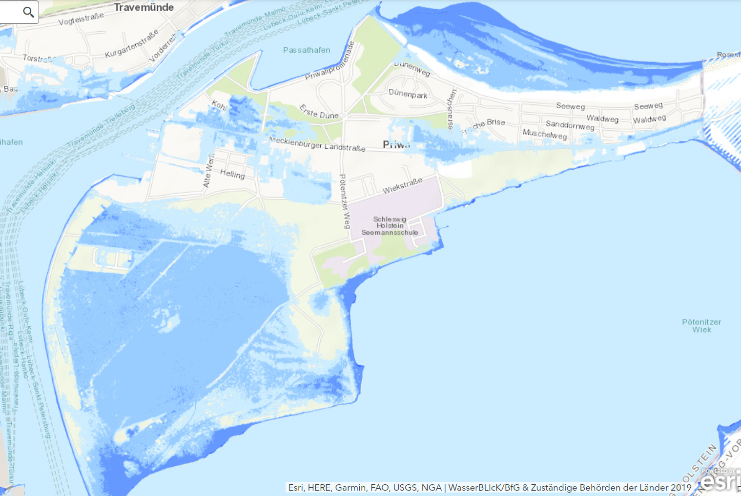 Das sagt uns aktuell die -> Hochwassergefahren-Karte der Bundesanstalt für Gewässerkunde. Hier eine Vorschau mit dem Ausschnitt zum Priwall: